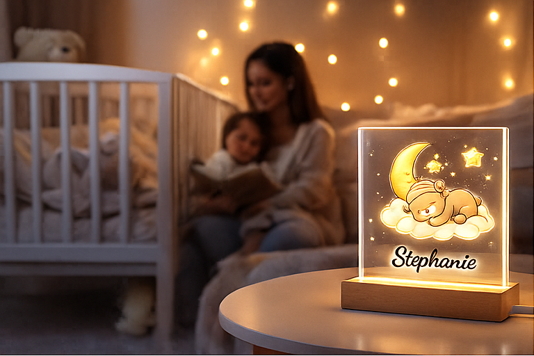 Create a peaceful bedtime routine with this custom LED night light featuring a cozy moon-sleeping bear and your child’s name. A soft, warm glow that makes nurseries and kids’ rooms feel safe, comforting, and magical.